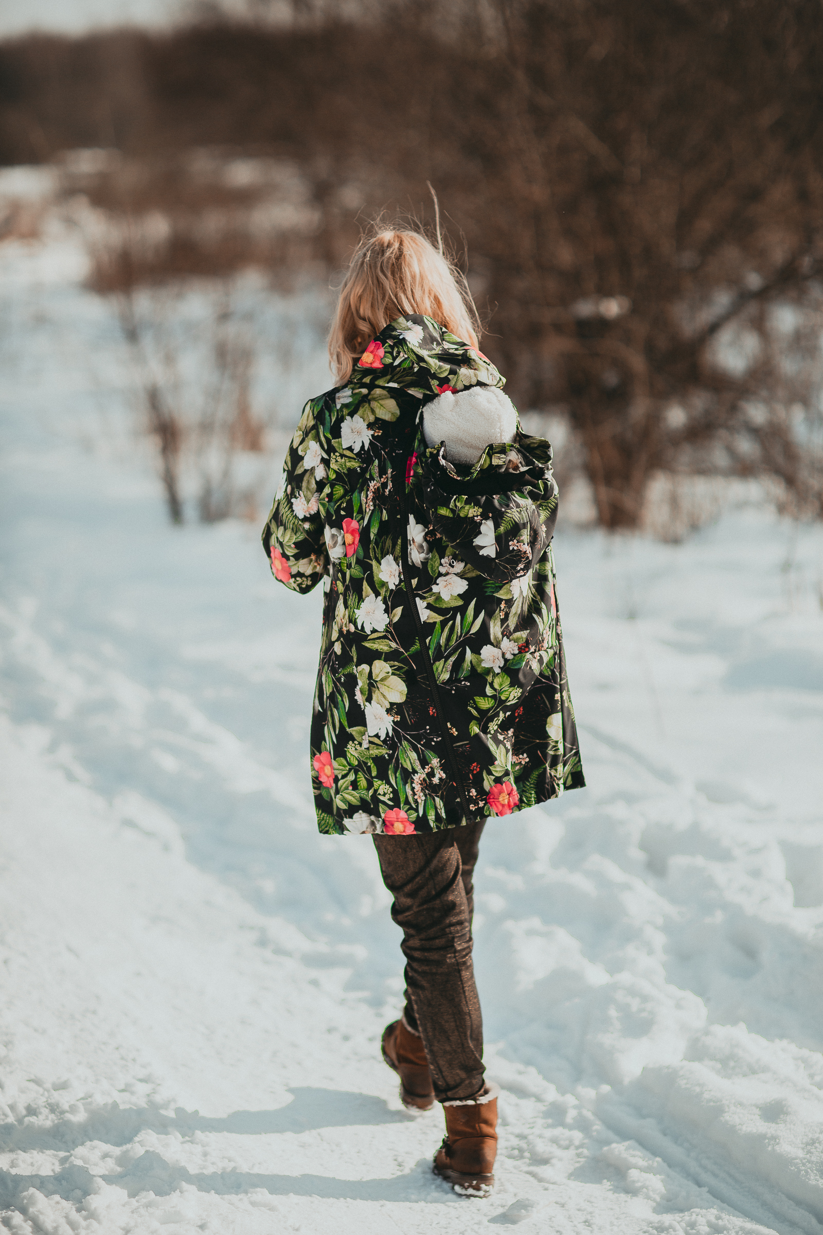 - Rovněž je zajištěno, že budete mít možnost zakrýt svůj krk a výstřih při nošení miminka v nosítku či šátku vpředu. Nosicí vsadka má speciální zapínání, které vás ochrání před chladem a větrem.