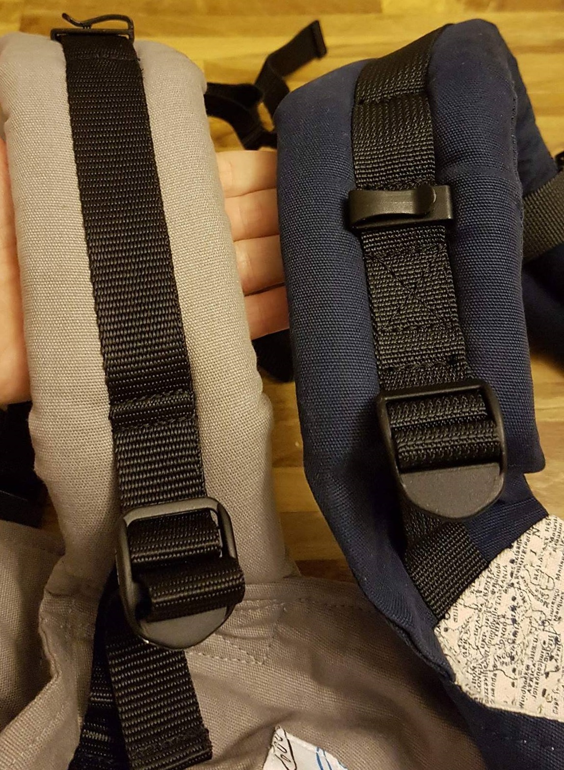 Zásadní rozdíl je vidět z obrázků níže hned na první pohled - je to střih nosítka. Isara je mnohem užší a o něco delší než Tula. Což by mohlo vyhovovat všem těm, kterým se zdá Tula příliš široká a nelíbí se jim, že jim látka na nosítku odstává (mě osobně to tedy nikdy nevadilo). Z obrázku je i patrné, že každé nosítko má jinde umístěné cvočky na kapucku, která je odepínací. U Tuly je možné si jí odložit do kapsičky na bederním pásu, Isara kapsičku nemá. U Isary je samozřejmě možné zádový panel zkrátit a přizpůsobit ho tak velikosti dítěte.