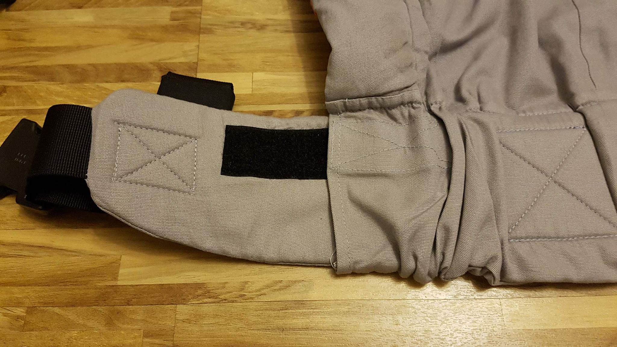 Celkem patrný je i rozdíl v polstrování nosítka na bocích v místech, kde má děťátko nožičky. Zatímco Tula má poměrně dost polstrovaný úzký pruh látky, Isara vypolstrovala větší prostor, ale zase o něco méně - na fotce níže je to poměrně pěkně vidět. Upřímně ale neumím posoudit, která varianta je lepší, při testování vypadaly děti spokojené v obou nosítkách, obě provedení vypadají pohodlně a ani jedno nosítko by tak děťátko nemělo tlačit.